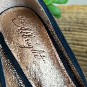 Beautiful, Navy suede leather pumps. Miss Albright “Specialty”. These could be special occasion or a bold fun statement. Nice cushioning on the insole. Leather soles with some divots. Very little heel. Minor scuffs on suede but not distracting. Zoom in on photos for details. Heel height is approximately 4 inches with a less than half inch platform at toe.