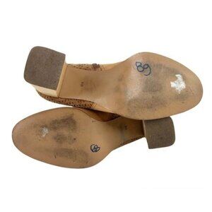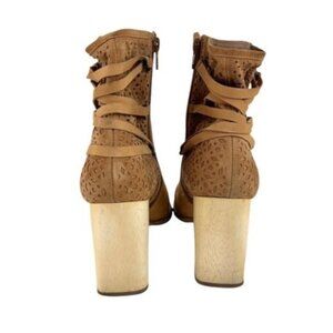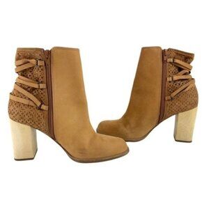 Miss Albright Suede Laser Cut Strappy Ankle Booties Wooden Heel. Size 8B. Side zipper. Minor wear. 3.5” heel.