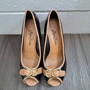 Miss Bisou 3.5 inches High Heels Black With Tan, Gold Buckle Open Toe Heels Women's Sz 6.5M