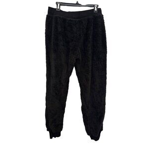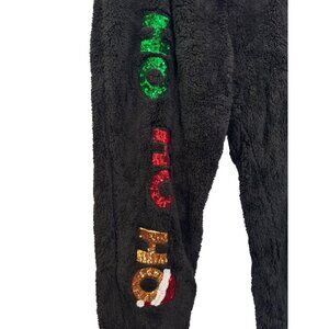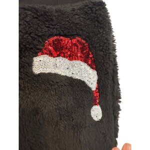 Miss Chevious Black Fuzzy Jogger Pants Large Sequin Ho Ho Ho & Santa Hat Design
