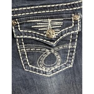 Excellent used condition Miss Chic women’s jeans. Dark wash bootcut style with heavy contrast stitching, fleur-de-lis button accents, and embroidered back flap pockets. Stretch denim for comfort. Bottom hems show intentional raw/frayed style.