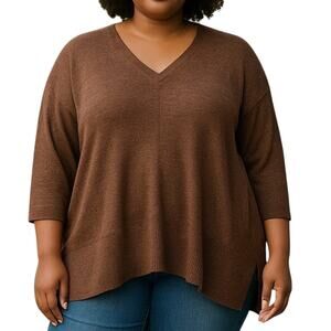 This Miss Chievous oversized V-neck sweater in size medium features a marbled pink, purple, and black design with a relaxed fit. The edgy V-neck, wide band with split sides, and fitted sleeves create a feminine and stylish look. Crafted from soft, cozy fabric, this pullover is perfect for casual wear or business casual layering. Ideal for cooler weather, it offers both comfort and classic style. Approximate measurements: pit to pit 25”, front length 28”, back length 29”. Model is plus size for fit reference. Available now on Poshmark, Mercari, and Depop.