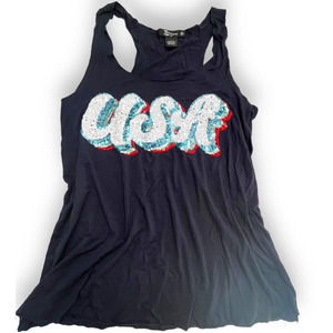 Shine bright at every patriotic event in this relaxed tank top with sequins that sparkle across the front! The easy hem can be left loose or tucked to fit your outfit of the day, while the festive USA text is ready to take on every summertime event.