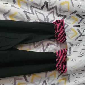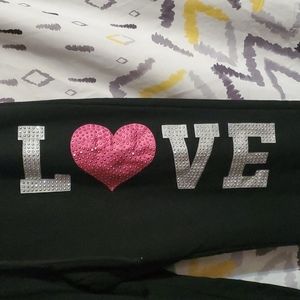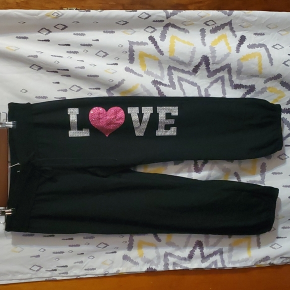 Very cute pair of pants with LOVE going up the left leg. if you turn up the bottom cuffs they are pink and black striped underneath that section. Very lightweight. I think they are still new because the tag holder is still on the pants.
