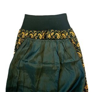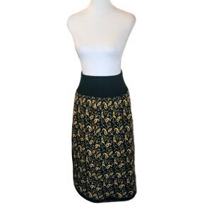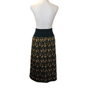 Details: This quirky Miss Chloe skirt set features a dark green and golden yellow filigree print, straight pull-on style, and is knee to midi length. The material is a wool blend reminiscent of sweater fabric, giving off a cozy eclectic vibe. It includes a separate dark green slip made of cupro cotton. Quality made in Japan, this skirt is incredibly rare and the only one available online.