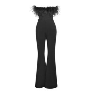 Trendy, jumpsuit, pantsuit, feathers, wide leg, flare leg, form fitting, strapless, evening, date night, red carpet, dressy, sexy, First class, Lux, furrym downy, plumy,