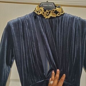 This stunning navy velvet dress features luxurious gold accents, perfect for any special occasion. The elegant design and rich color make it a standout piece in any wardrobe.