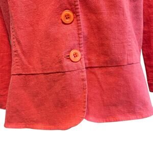 Linen blend short blazer. Orange in color. Double Breasted. Buttons down front. 3/4 sleeve. Padded shoulders.