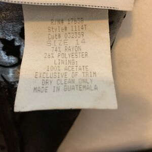 Measures 20” pit to pit..it has short sleeves and long zipper in back of top. Wear with black pants or skirt..Fabric is a polyester/rayon blend..