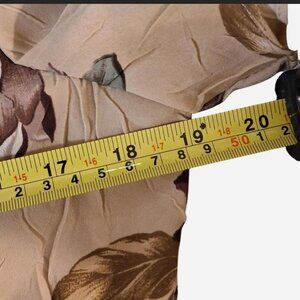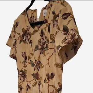 Miss Dorby, vintage, maxi dress, crinkle, floral print with brown, tan and green hues, round neck, attached necklace, loose short sleeves, back zipper that is 21 inches in length, size 8 with a pit-to pit of 19 inches across. #Vintage #Maxi #Fall