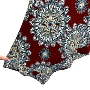 Details: Beautiful rich color Long Tunic Top. Bold graphic design size M. Qtr Sleeves, Round neckline, Pull over Tunic Top. Has a shaped hem that drapes longer at the sides. Great with Jeans, Leggings, Boots, Booties.