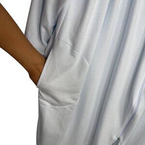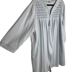 Keywords: women's robe, zip front robe, embroidered robe, lightweight robe, 3X nightgown, blue robe, Miss Elaine robe, lounge robe, floral detail robe, homewear robe, soft fabric robe, plus size robe, comfortable robe