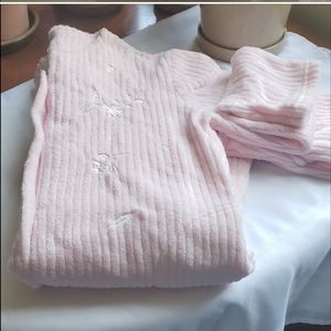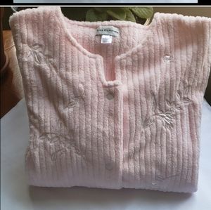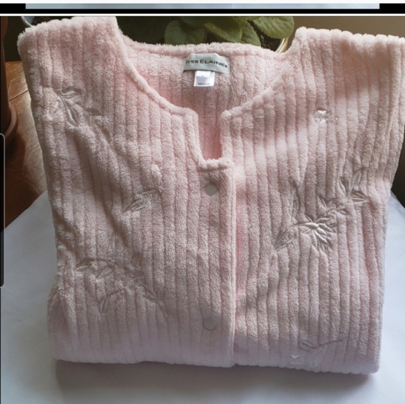 Pink size small Miss Elaine knee length Robe. Embroidery design. Snap front closures. Polyester. Machine wash and dry. Two side pockets. Like new condition.