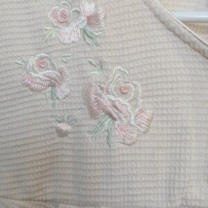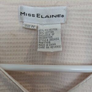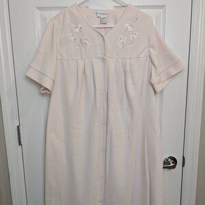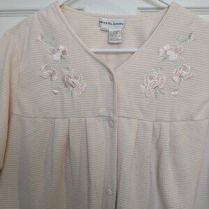 This Miss Elaine house coat or robe blends comfort and style in a light pink waffle knit design with embroidered details. Featuring snap closures, short sleeves, and convenient side pockets, it measures 22 inches from armpit to armpit and 42 inches from the center back of the neckline to the hem. Made of a soft polyester-cotton blend, it shows some pilling and minor stains as pictured but remains in good pre-owned condition, perfect for cozy lounging.