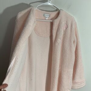 Beautifully soft pink robe in this classic brand, zipper not belted. Has some embroidery, see all photos and review measurements. Sorry that the tags are so faded!