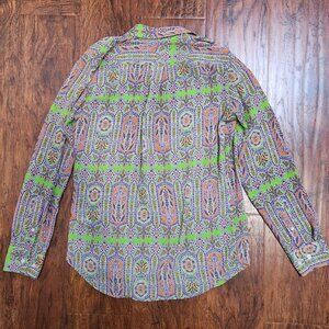 Ralph Lauren polyester button down blouse with bright, intricate paisley and floral pattern.