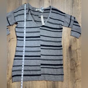 Stylish gray and black striped sweater. Perfect for casual wear.