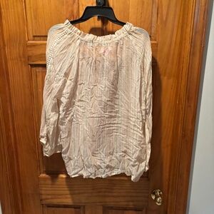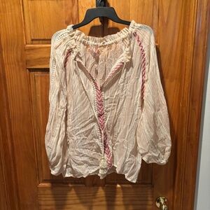 Miss June Peasant Top in cream, mauve and metallic gold threading. Tassel tie neckline. Women's size large. New with tags.