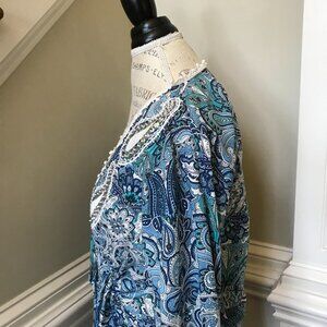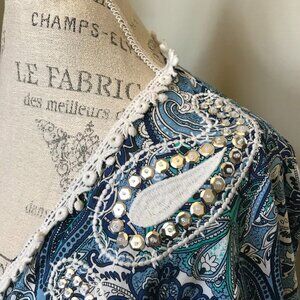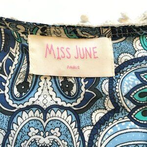 Women's Miss June Mini Dress in a size Small / Medium. No size tag please see measurements. All over paisley print in blue and white colors. Originally $368. Fast Same Day Shipping.