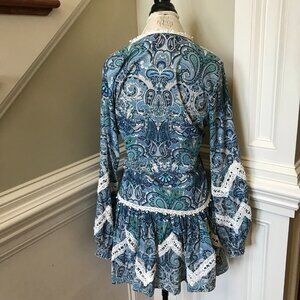 Miss June Kiara Mini Dress Womens Small Medium Blue White Paisley V-Neck Tassels