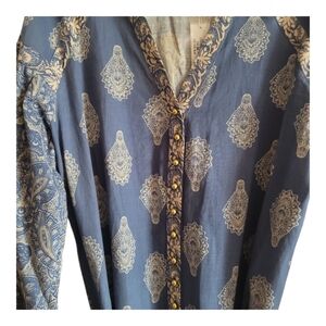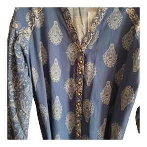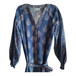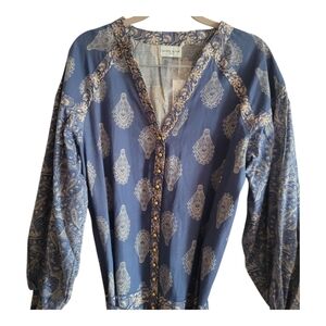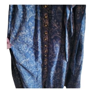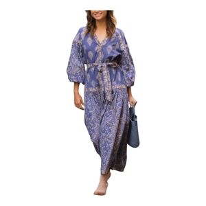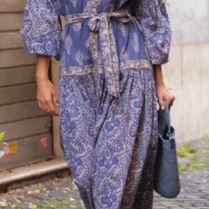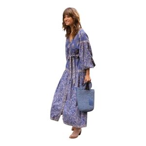 The Isabela Dress by Miss June Paris is a maxi dress that embodies bohemian elegance with refined details. Crafted from lightweight cotton, it features an eye-catching bohemian print. The dress includes a button-front design, a drop waist, and stylish balloon sleeves. A matching belt accentuates the waist, offering a customizable fit, while gold buttons add a subtle, eye-catching shine.