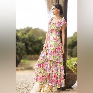 Embrace elegance with this vibrant floral maxi dress. Perfect for any occasion, it features a stunning mix of pink and green hues.