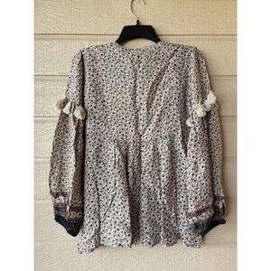New with Tags, Miss June Paris women's Floral Print Embroidered Tasseled Peasant Babydoll Style Blouse, OS One Size (fits XS-Medium US or Small-Large EU sizing), ivory beige with tiny maroon/green/teal/gold floral pattern, round neck with tie plus 2 hook & eye modesty closures at V, white embroidered paisley design around neckline, multiple beige yarn tassels with gold metallic threading, long sleeve with elasticized cuff and accent maroon/gold/teal/black border trim.