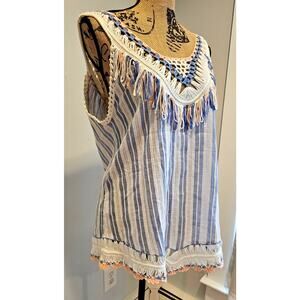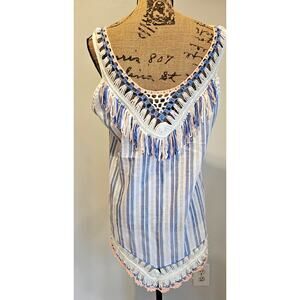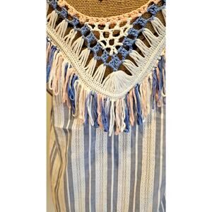 Miss Koo Paris Fringe V Neck Knit Crochet Cotton Blend Spring Top Shirt, Sz L