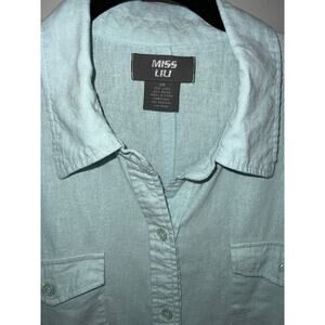 Miss Lili size 2X linen blend blue beachy roll tab half sleeve blouse button up
