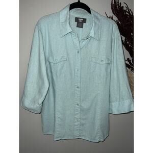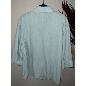 Super nice quality and style! Beach blue linen rayon blend with nice details. Style as a blouse or as a layering piece. Get two different looks with the sleeves up or sleeves down. In excellent condition! Feel free to contact me with any questions and thanks for looking!