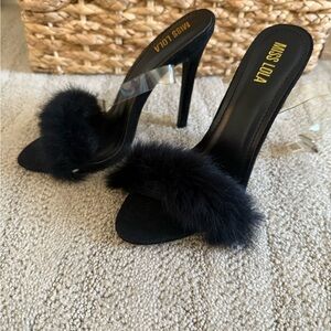 Elevate your look with these stunning black fur heels by Miss Lola. Perfect for a night out. Clear ankle strap Gently worn, great condition, runs a tad small