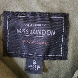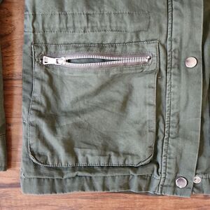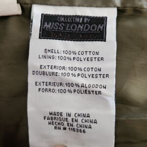 Excellent used condition, Miss London lightweight utility jacket. women's size small. Full front zipper with 2 zipper pockets and 2 snap front pockets. Drawstring hood. Army green.