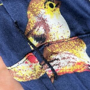 Description- blue in color with a unique multi bird print. Halter top style. Smocking on the back.