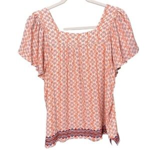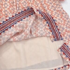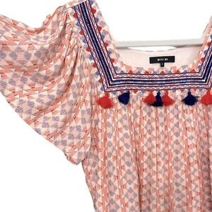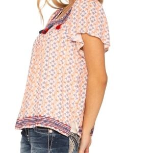 geo print with a southwest vibe, embroidered trims, ruffle sleeves, and tassel detailing at the square neck.