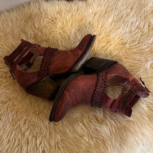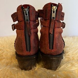 Distressed red leather booties with tiny brass studs that frame the toe, three straps framing the top of the boots and a braided harness. They have a round toe, leather sole, back zip closure and leather lined. In excellent worn condition.