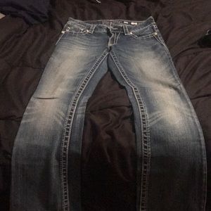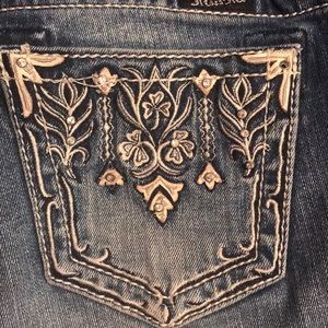 boot cut jeans size 28 they have been hemmed to 31 1/2” inseam. Used and very loved but they are too big for me now. They have a bit of wear on the bottom hem but there’s no holes or wear spots. They are missing a couple of rhinestones but it’s not noticeable.