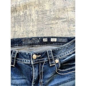 Chloe boot cut jeans from Miss Me. Zip fly, classic 5 pocket styling, and Miss Me signature logo patch on back waistband. Back pockets have a gorgeous embroidered and rhinestone embellished back pockets. Whiskering and fading on the seat and thighs. Please note: these jeans have been hemmed. They originally had a 32" inseam, and now have an approx 28" inseam. Please see photos for approximate measurements and pic of the hemming.