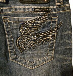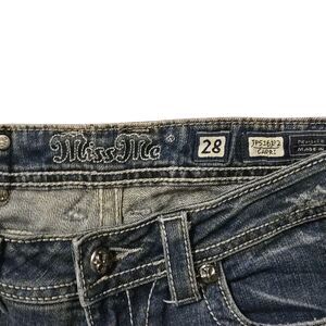 The product is a pair of Miss Me Angel Wings low rise capri jeans in size 28. These rockabilly cowgirl western country-themed jeans feature embroidered accents and are designed for women who are fans of unique and stylish denim. The blue color and low rise fit give these jeans a trendy and flattering appearance, perfect for those looking to make a statement with their fashion choices.