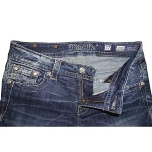 Miss Me signature ankle skinny jeans, size 27, designed with glam crystal-embellished pockets, heavy stitch detailing, and rhinestone rivets. The perfect denim for Y2K lovers, Western glam outfits, or festival-ready streetwear. Mid-rise with stretch for comfort. Style #JP5970AK, color MK 266.