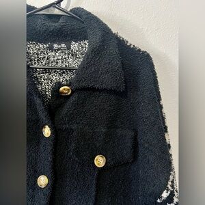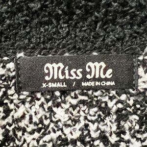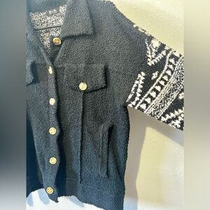 Stunning Miss Me branded Wubby style shirt jacket/shacket in a heavier weight plush/boucle inspired knit fabrication, black front with contrasting white and black Aztec patterned sleeves and back, front button chest flap pockets, front side pockets, button down front closure, oversized fit. Would fit a small/medium depending on desired fit.