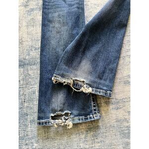 Mid rise boot cut jeans from Miss Me. Lots of beads, rhinestones, studs, and embroidery. Whiskering and fading on the seat and thighs. Zip fly, classic 5 pocket styling, Miss Me signature logo patch on back waistband. Jeans have some damage to hems. See last photo for reference.