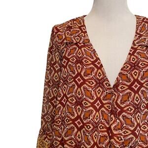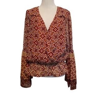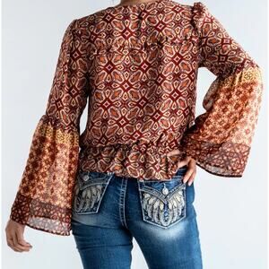 Miss Me Bianca Top Womens Large Rust Mixed Geo Print Bell Sleeve Boho Blouse