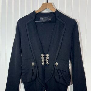 Miss Me jacket, black knit blazer, military style cardigan, steampunk gothcore, double breasted jacket, belted waist, structured knit blazer, button front jacket, edgy business casual, dark academia outerwear, cottage noir, Miss Me small jacket, Y2K inspired