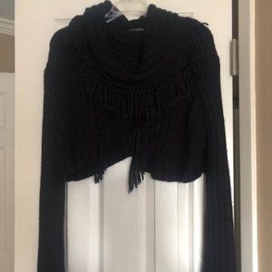 Miss Me Black Knit Fringe Cropped Sweater – Size L – Boho Drama in a Cozy Package 🖤