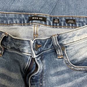 These Miss Me jeans feature a medium blue wash with stylish distressing for a trendy, worn-in look. The ankle-length cut and frayed hem add a modern touch, making them perfect for casual outings. Enjoy the comfortable fit and chic style of these must-have jeans.
