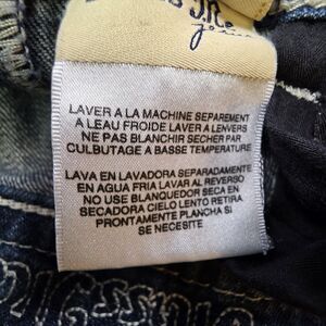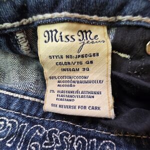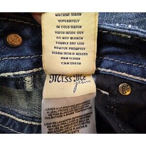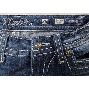 The product is a pair of Miss Me blue boot cut jeans with rhinestone embellished studs, designed for women in size 26. Made from denim fabric with a low rise and distressed wash, these jeans feature a 5-pocket design with a zip and button closure. The style includes accents like rhinestones, embroidery, and stretch material for added comfort. Perfect for all seasons, these designer jeans offer a blend of cowgirl and classic touch with a hint of preppy style. Machine washable and part of the Miss Me product line, these jeans are a stylish addition to any wardrobe.