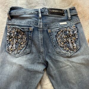 These Miss Me jeans feature a light to medium wash blue denim with a stylish distressed look. The boot cut design offers a flattering fit, while the contrast stitching adds a unique touch to the overall appearance.