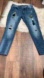 Trendy blue jeans with unique patchwork. Comfortable boyfriend fit. Perfect for casual wear.