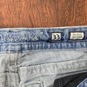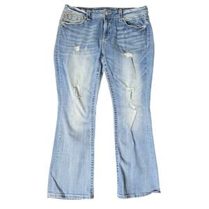 Stylish Miss Me jeans in blue. Features gold embellishments on back pockets. Perfect for casual wear.
