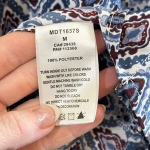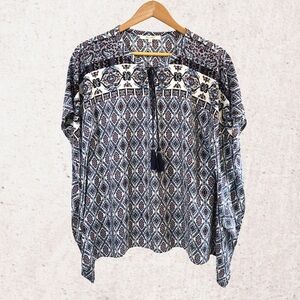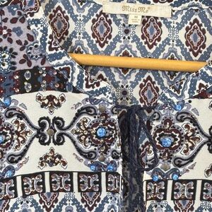 Embrace a relaxed style with this Miss Me blouse, featuring flutter sleeves and a tie front. The blue and white color scheme is complemented by an intricate geometric pattern, offering a breezy and comfortable fit. Perfect for adding a touch of elegance to your casual wardrobe.